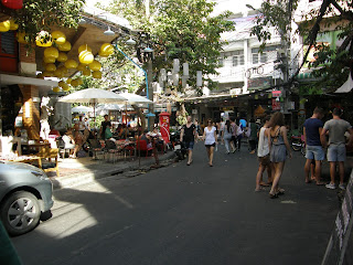 After a well deserved sleep for Geno and Glenda after the long trip over the pond, we decided to show them Khoa San Road. This short street has developed into a world famous backpacker ghetto. It offers cheap accommodations ranging from mattress in a box style hotels to reasonably priced 3-star hotels. It serves as a base of travel for major tourist destinations in Thailand and the neighbouring countries of Laos, Cambodia, Malaysia, and Vietnam. Khoa San shops sell handcrafts, paintings, clothes, local fruit, pirated CD's, used books, plus many useful backpacker items. During the evening, the streets turn into bars and music is played, food hawkers sell barbequed insects, exotic snacks for tourists(I tried to take a picture of scorpions on a stick, but the lady selling this snack said No, No). Several pubs and bars serve as meeting places for travelers to exchange travel stories and personal histories. It's a fun place to spend some time and have a couple of beer!